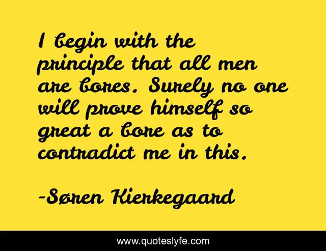 This page presents the quote "I begin with the principle that all men are bores. Surely no one will prove himself so great a bore as to contradict me in this.". Author of this quote is Søren Kierkegaard. .