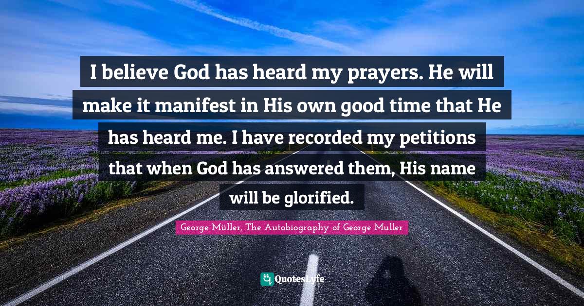 This page presents the quote "I believe God has heard my prayers. He will make it manifest in His own good time that He has heard me. I have recorded my petitions that when God has answered them, His name will be glorified.". Author of this quote is George Müller, The Autobiography of George Muller. This quote is about christianity, prayer,.