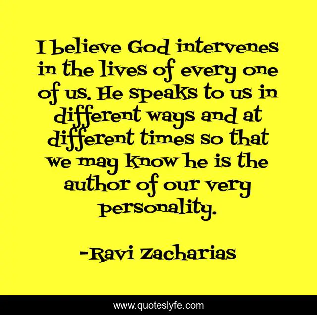 This page presents the quote "I believe God intervenes in the lives of every one of us. He speaks to us in different ways and at different times so that we may know he is the author of our very personality.". Author of this quote is Ravi Zacharias. This quote is about god, christianity, purpose, jesus,.