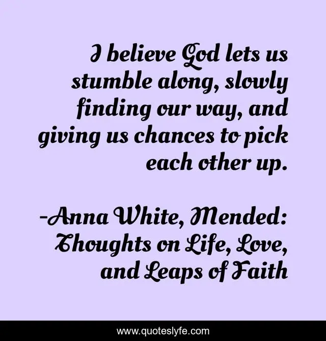 "Anna White, Mended: Thoughts on Life, Love, and Leaps of Faith Quotes." Quoteslyfe.com, 2025. Tue. 09 Dec. 2025. <https://www.quoteslyfe.com/quote/I-believe-God-lets-us-stumble-along-120662>.