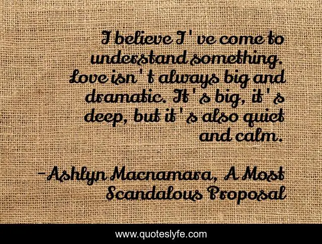 This page presents the quote "I believe I've come to understand something. Love isn't always big and dramatic. It's big, it's deep, but it's also quiet and calm.". Author of this quote is Ashlyn Macnamara, A Most Scandalous Proposal. This quote is about love, big, quiet, deep, dramatic, calm, affection,.