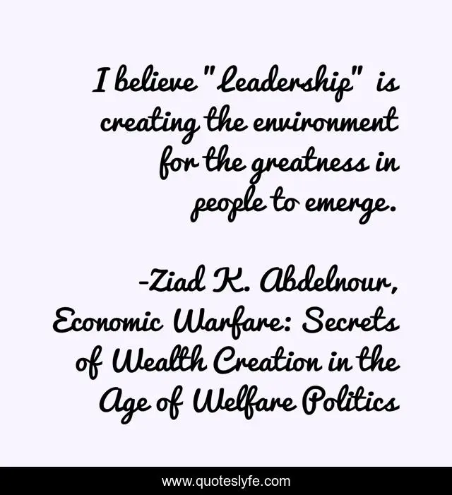 This page presents the quote "I believe "Leadership" is creating the environment for the greatness in people to emerge.". Author of this quote is Ziad K. Abdelnour, Economic Warfare: Secrets of Wealth Creation in the Age of Welfare Politics. This quote is about leadership, greatness,.
