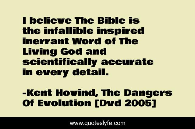 This page presents the quote "I believe The Bible is the infallible inspired inerrant Word of The Living God and scientifically accurate in every detail.". Author of this quote is Kent Hovind, The Dangers Of Evolution [Dvd 2005]. This quote is about science, bible, word-of-god, god, apologetics,.