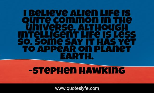 This page presents the quote "I believe alien life is quite common in the universe, although intelligent life is less so. Some say it has yet to appear on planet Earth.". Author of this quote is Stephen Hawking. This quote is about universe, life, believe,.