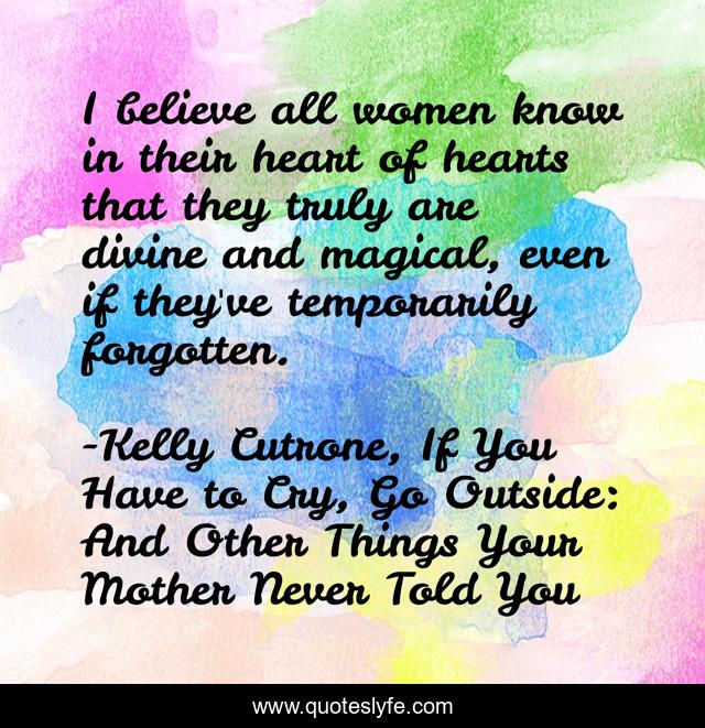 This page presents the quote "I believe all women know in their heart of hearts that they truly are divine and magical, even if they've temporarily forgotten.". Author of this quote is Kelly Cutrone, If You Have to Cry, Go Outside: And Other Things Your Mother Never Told You. This quote is about enthusiasm, divine, magical, inspirational, women,.
