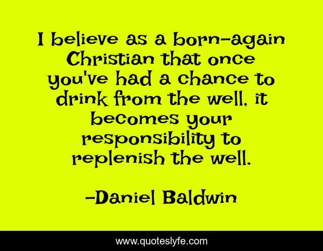 This page presents the quote "I believe as a born-again Christian that once you've had a chance to drink from the well, it becomes your responsibility to replenish the well.". Author of this quote is Daniel Baldwin. This quote is about believe, responsibility,.