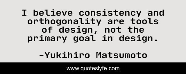 This page presents the quote "I believe consistency and orthogonality are tools of design, not the primary goal in design.". Author of this quote is Yukihiro Matsumoto. This quote is about believe, goal, consistency,.