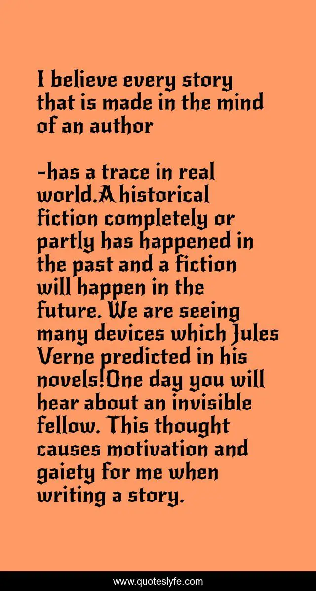 "has a trace in real world.A historical fiction completely or partly has happened in the past and a fiction will happen in the future. We are seeing many devices which Jules Verne predicted in his novels!One day you will hear about an invisible fellow. This thought causes motivation and gaiety for me when writing a story. Quotes." Quoteslyfe.com, 2025. Fri. 05 Dec. 2025. <https://www.quoteslyfe.com/quote/I-believe-every-story-that-is-made-101040>.