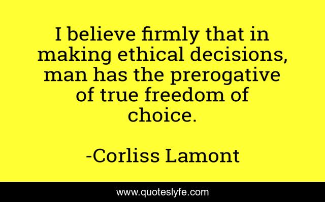 This page presents the quote "I believe firmly that in making ethical decisions, man has the prerogative of true freedom of choice.". Author of this quote is Corliss Lamont. This quote is about believe, decisions, man,.
