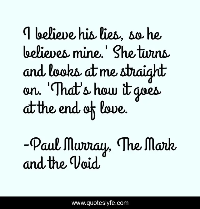 This page presents the quote "I believe his lies, so he believes mine.' She turns and looks at me straight on. 'That's how it goes at the end of love.". Author of this quote is Paul Murray, The Mark and the Void. This quote is about relationships, lies, love, affection, end-of-love,.