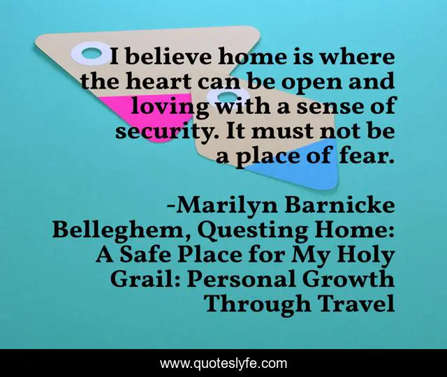 This page presents the quote "I believe home is where the heart can be open and loving with a sense of security. It must not be a place of fear.". Author of this quote is Marilyn Barnicke Belleghem, Questing Home: A Safe Place for My Holy Grail: Personal Growth Through Travel. This quote is about home, quest, safe, love, affection,.