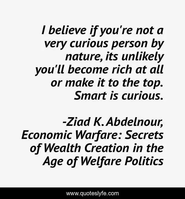 This page presents the quote "I believe if you're not a very curious person by nature, its unlikely you'll become rich at all or make it to the top. Smart is curious.". Author of this quote is Ziad K. Abdelnour, Economic Warfare: Secrets of Wealth Creation in the Age of Welfare Politics. This quote is about curious, top, rich, smart,.
