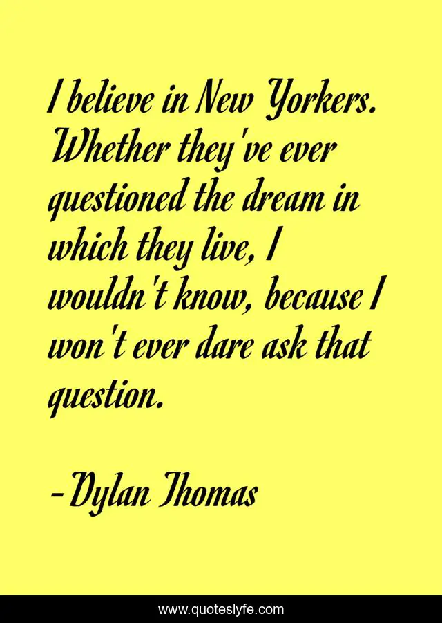 This page presents the quote "I believe in New Yorkers. Whether they've ever questioned the dream in which they live, I wouldn't know, because I won't ever dare ask that question.". Author of this quote is Dylan Thomas. .