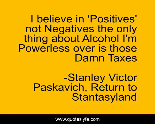 This page presents the quote "I believe in 'Positives' not Negatives the only thing about Alcohol I'm Powerless over is those Damn Taxes". Author of this quote is Stanley Victor Paskavich, Return to Stantasyland. This quote is about alcoholic-humor-prescription, alcohol, alcoholism,.