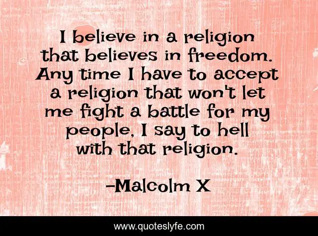 This page presents the quote "I believe in a religion that believes in freedom. Any time I have to accept a religion that won't let me fight a battle for my people, I say to hell with that religion.". Author of this quote is Malcolm X. This quote is about freedom, believe, time,.