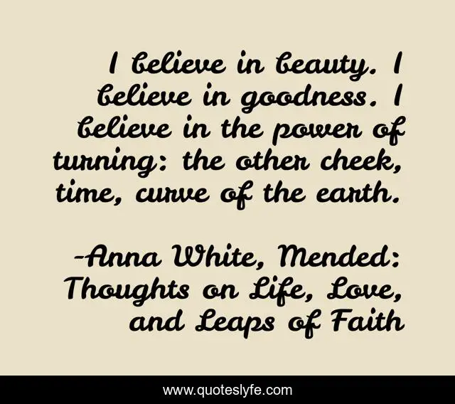 "Anna White, Mended: Thoughts on Life, Love, and Leaps of Faith Quotes." Quoteslyfe.com, 2025. Sat. 06 Dec. 2025. <https://www.quoteslyfe.com/quote/I-believe-in-beauty-I-believe-in-146868>.