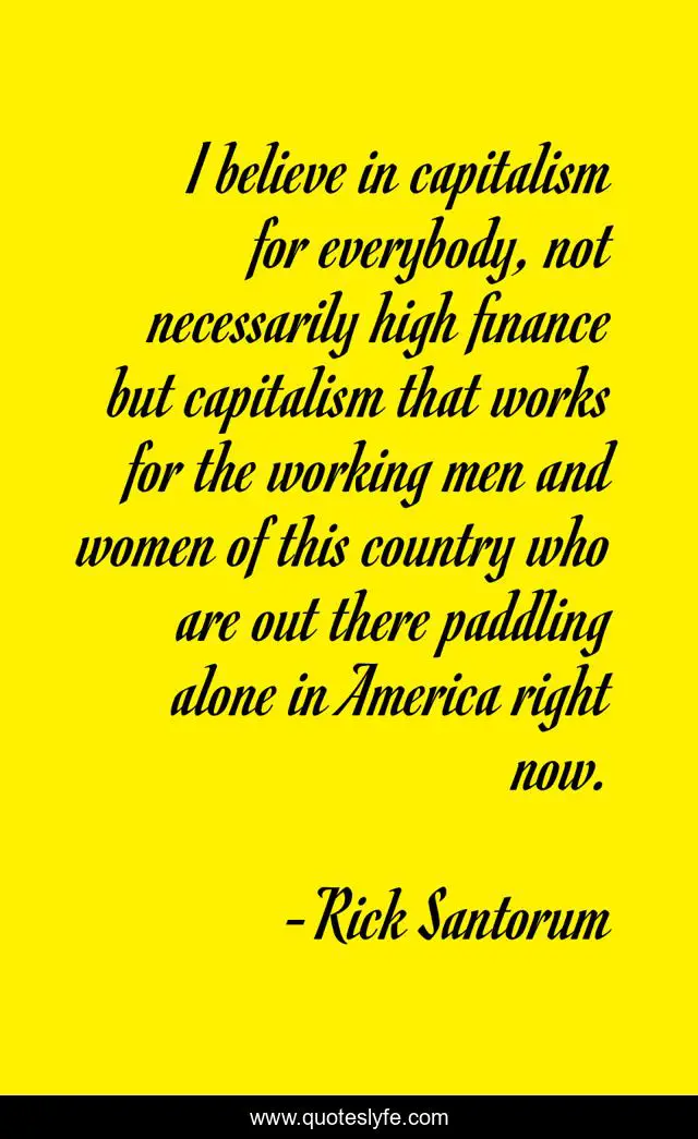This page presents the quote "I believe in capitalism for everybody, not necessarily high finance but capitalism that works for the working men and women of this country who are out there paddling alone in America right now.". Author of this quote is Rick Santorum. This quote is about alone, america, women,.