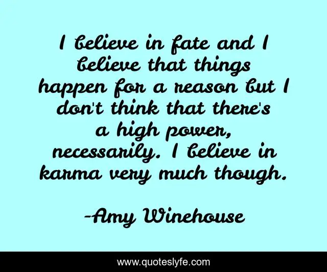 This page presents the quote "I believe in fate and I believe that things happen for a reason but I don't think that there's a high power, necessarily. I believe in karma very much though.". Author of this quote is Amy Winehouse. This quote is about karma, fate,.
