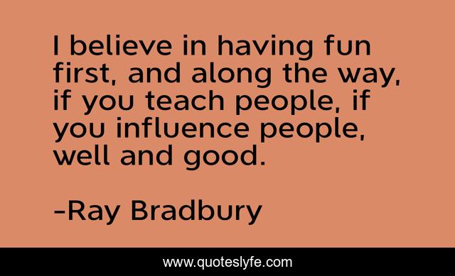 This page presents the quote "I believe in having fun first, and along the way, if you teach people, if you influence people, well and good.". Author of this quote is Ray Bradbury. This quote is about fun, influence,.
