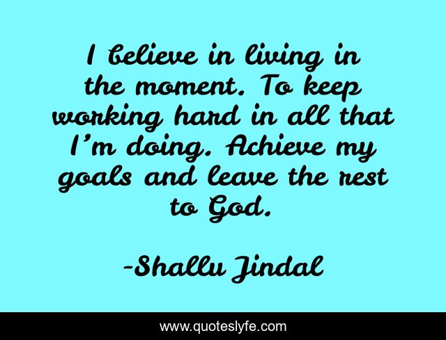 This page presents the quote "I believe in living in the moment. To keep working hard in all that I’m doing. Achieve my goals and leave the rest to God.". Author of this quote is Shallu Jindal. This quote is about life-philosophy, life, life-and-living,.