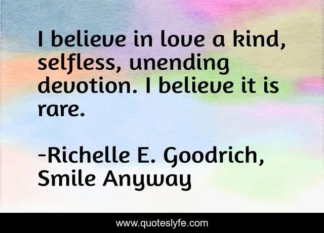 This page presents the quote "I believe in love―a kind, selfless, unending devotion. I believe it is rare.". Author of this quote is Richelle E. Goodrich, Smile Anyway. This quote is about true-love, love, selflessness, richelle, devotion, richelle-goodrich, kindness, affection,.