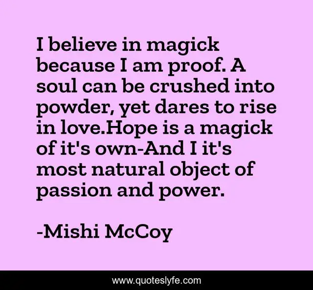 This page presents the quote "I believe in magick because I am proof. A soul can be crushed into powder, yet dares to rise in love.Hope is a magick of it's own-And I it's most natural object of passion and power.". Author of this quote is Mishi McCoy. This quote is about magic, magical, hope,.