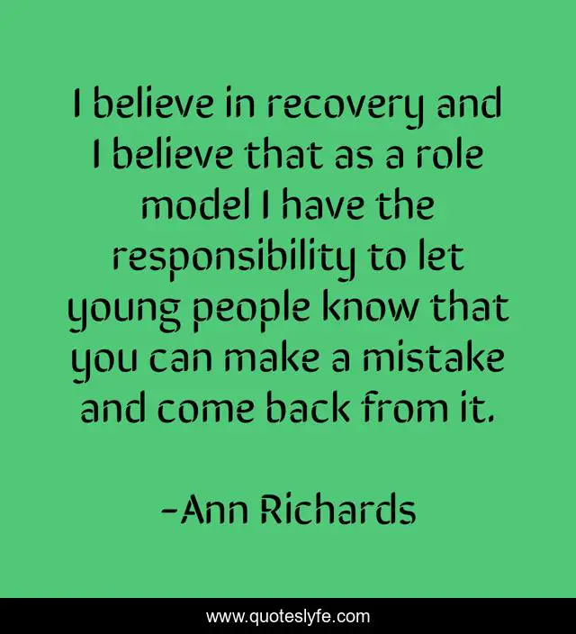 This page presents the quote "I believe in recovery and I believe that as a role model I have the responsibility to let young people know that you can make a mistake and come back from it.". Author of this quote is Ann Richards. This quote is about models, role,.