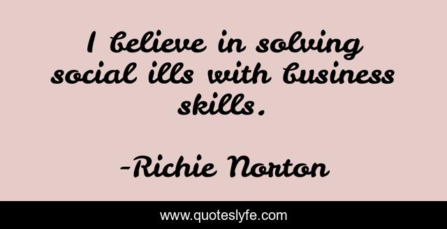 This page presents the quote "I believe in solving social ills with business skills.". Author of this quote is Richie Norton. This quote is about confidence, self-mastery, mindful, marketing, work, success, self-help, entrepreneur, innovation,.