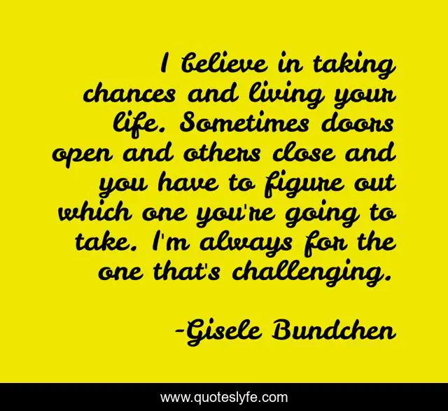 This page presents the quote "I believe in taking chances and living your life. Sometimes doors open and others close and you have to figure out which one you're going to take. I'm always for the one that's challenging.". Author of this quote is Gisele Bundchen. This quote is about i believe, life, believe,.