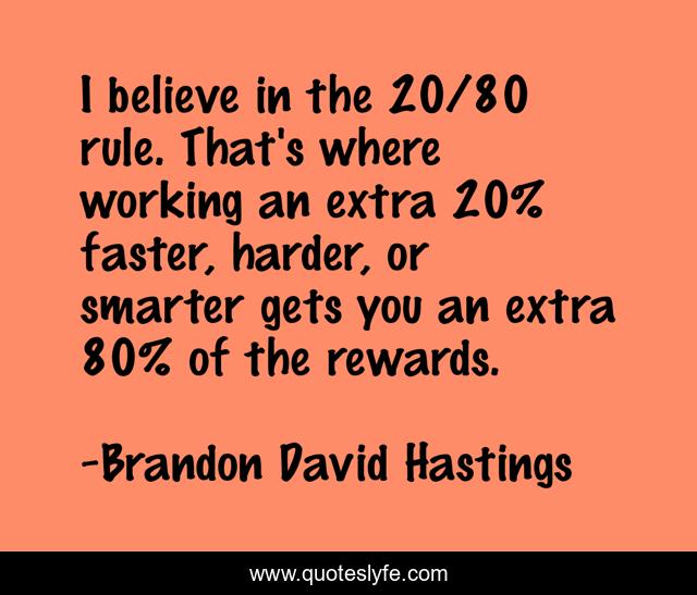 This page presents the quote "I believe in the 20/80 rule. That's where working an extra 20% faster, harder, or smarter gets you an extra 80% of the rewards.". Author of this quote is Brandon David Hastings. This quote is about enthusiasm, humourous, business, inspirational,.