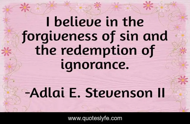 This page presents the quote "I believe in the forgiveness of sin and the redemption of ignorance.". Author of this quote is Adlai E. Stevenson II. This quote is about politics, forgiveness, beliefs, ignorance,.