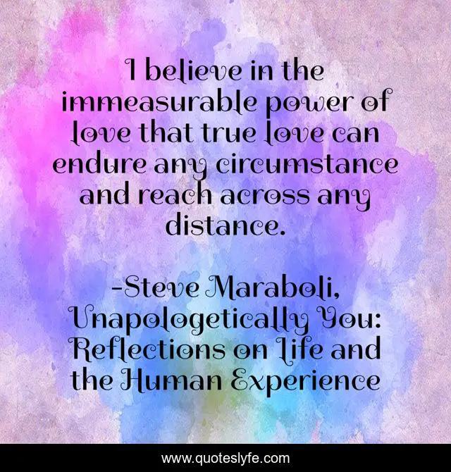 This page presents the quote "I believe in the immeasurable power of love that true love can endure any circumstance and reach across any distance.". Author of this quote is Steve Maraboli, Unapologetically You: Reflections on Life and the Human Experience. This quote is about relationships, distance, love, soul-mates, power, circumstance, long-distance-love, endure, inspirational,.