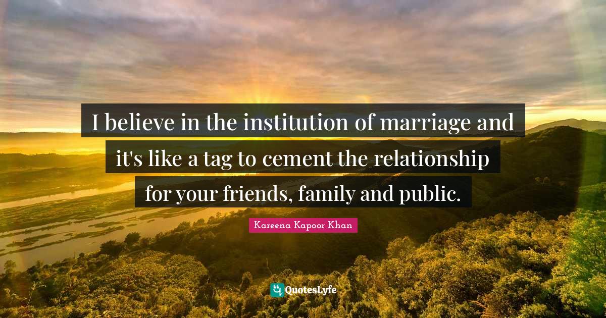 This page presents the quote "I believe in the institution of marriage and it's like a tag to cement the relationship for your friends, family and public.". Author of this quote is Kareena Kapoor Khan. This quote is about family, relationship,.