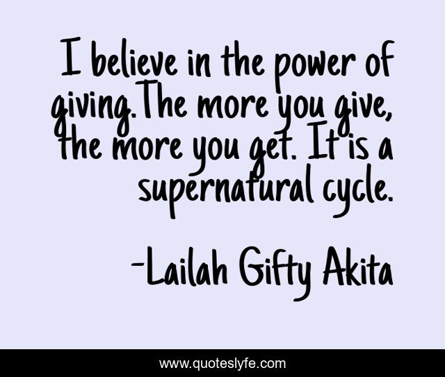 This page presents the quote "I believe in the power of giving.The more you give, the more you get. It is a supernatural cycle.". Author of this quote is Lailah Gifty Akita. .