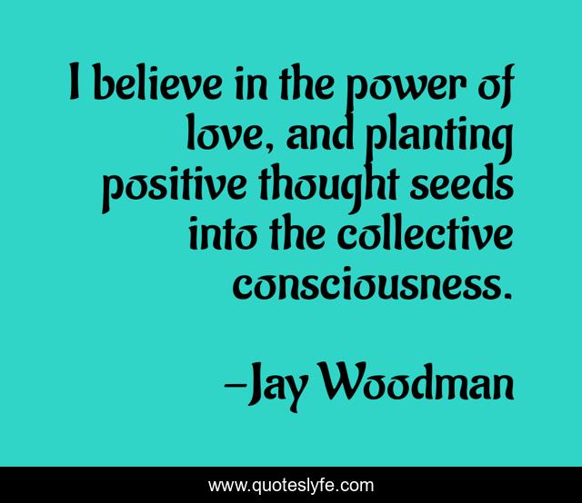 This page presents the quote "I believe in the power of love, and planting positive thought seeds into the collective consciousness.". Author of this quote is Jay Woodman. This quote is about planting, confidence, consciousness, positive, collective, power-of-love, thought, seeds,.