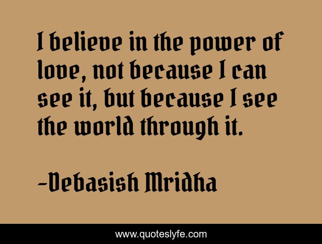 This page presents the quote "I believe in the power of love, not because I can see it, but because I see the world through it.". Author of this quote is Debasish Mridha. This quote is about life, love, knowledge, inspirational, intelligence, philosophy, wisdom, quotes, affection,.