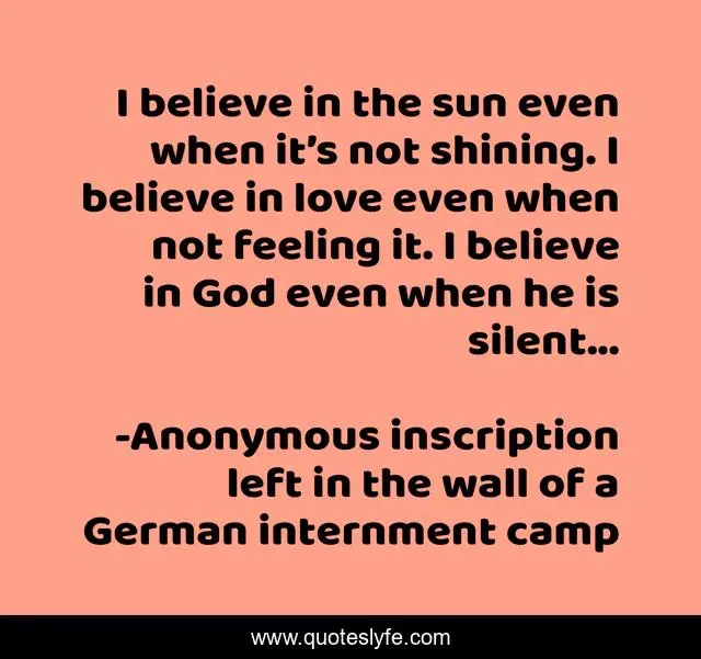 "Anonymous inscription left in the wall of a German internment camp Quotes." Quoteslyfe.com, 2025. Sat. 06 Dec. 2025. <https://www.quoteslyfe.com/quote/I-believe-in-the-sun-even-when-154357>.