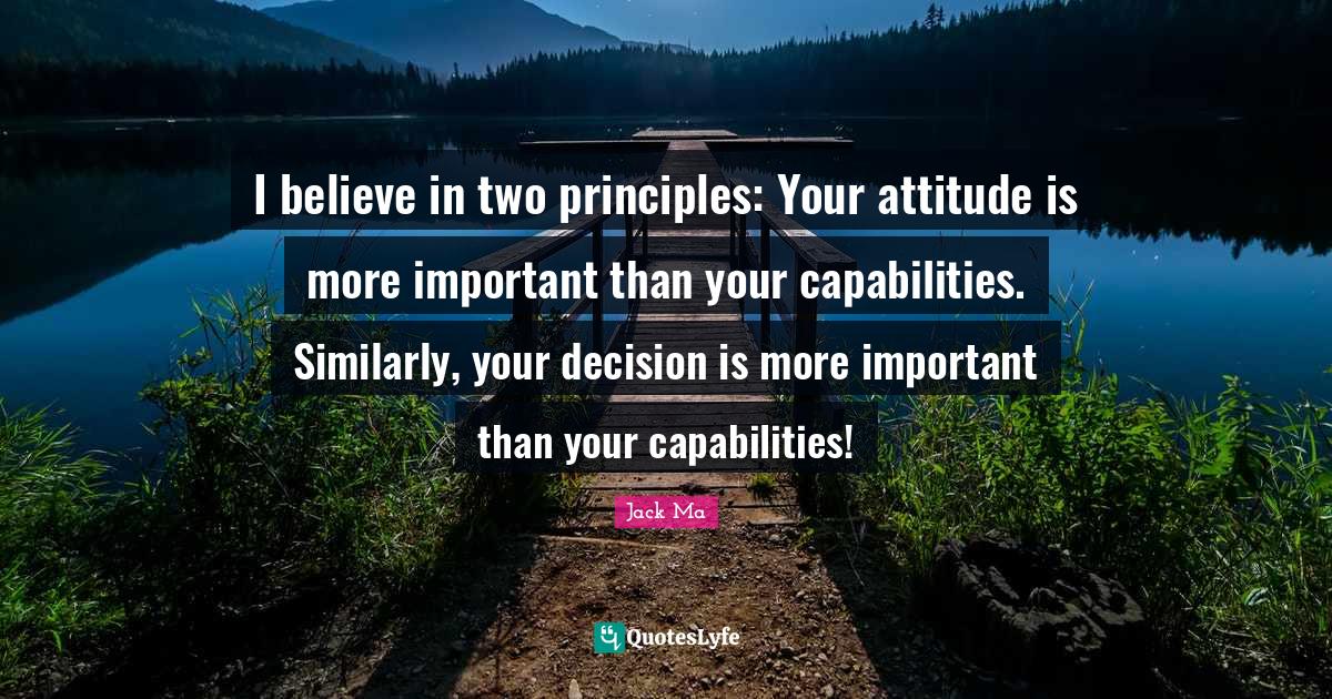 This page presents the quote "I believe in two principles: Your attitude is more important than your capabilities. Similarly, your decision is more important than your capabilities!". Author of this quote is Jack Ma. This quote is about important, decision, attitude, two, principles, believe, i believe in,.