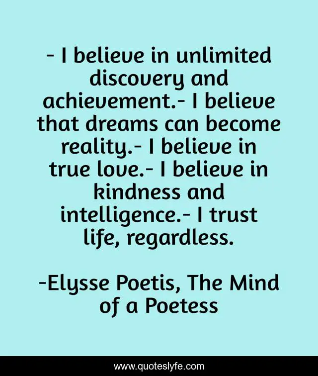 "Elysse Poetis, The Mind of a Poetess Quotes." Quoteslyfe.com, 2025. Sat. 06 Dec. 2025. <https://www.quoteslyfe.com/quote/I-believe-in-unlimited-discovery-and-achievement-115437>.