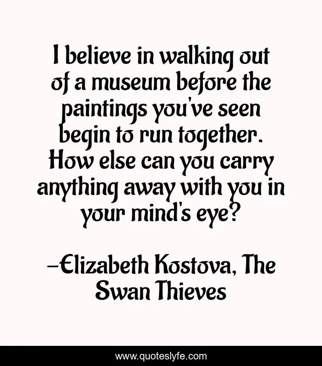 This page presents the quote "I believe in walking out of a museum before the paintings you've seen begin to run together. How else can you carry anything away with you in your mind's eye?". Author of this quote is Elizabeth Kostova, The Swan Thieves. This quote is about museum, art,.