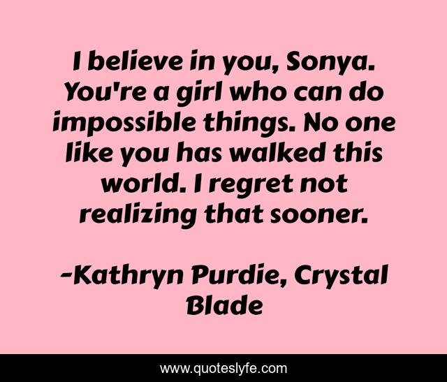 This page presents the quote "I believe in you, Sonya. You're a girl who can do impossible things. No one like you has walked this world. I regret not realizing that sooner.". Author of this quote is Kathryn Purdie, Crystal Blade. This quote is about romance, fantasy, ya,.