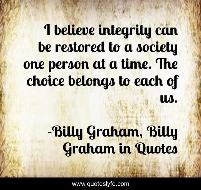 This page presents the quote "I believe integrity can be restored to a society one person at a time. The choice belongs to each of us.". Author of this quote is Billy Graham, Billy Graham in Quotes. This quote is about integrity, billy-graham,.