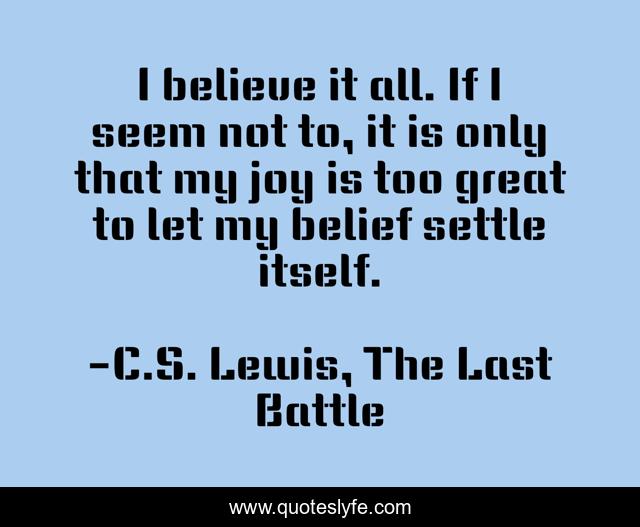 This page presents the quote "I believe it all. If I seem not to, it is only that my joy is too great to let my belief settle itself.". Author of this quote is C.S. Lewis, The Last Battle. This quote is about joy, belief,.