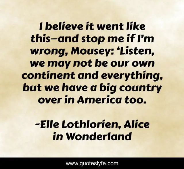 This page presents the quote "I believe it went like this—and stop me if I’m wrong, Mousey: ‘Listen, we may not be our own continent and everything, but we have a big country over in America too.". Author of this quote is Elle Lothlorien, Alice in Wonderland. .