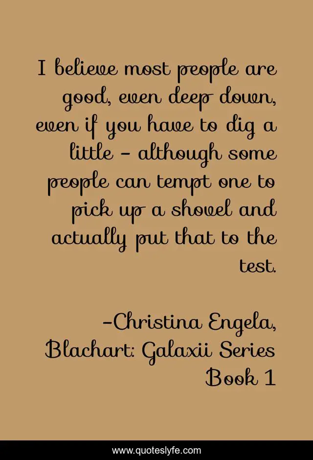 This page presents the quote "I believe most people are good, even deep down, even if you have to dig a little - although some people can tempt one to pick up a shovel and actually put that to the test.". Author of this quote is Christina Engela, Blachart: Galaxii Series Book 1. This quote is about shovel, dig, pick-up, good, tempt, test, deep-down, believe,.