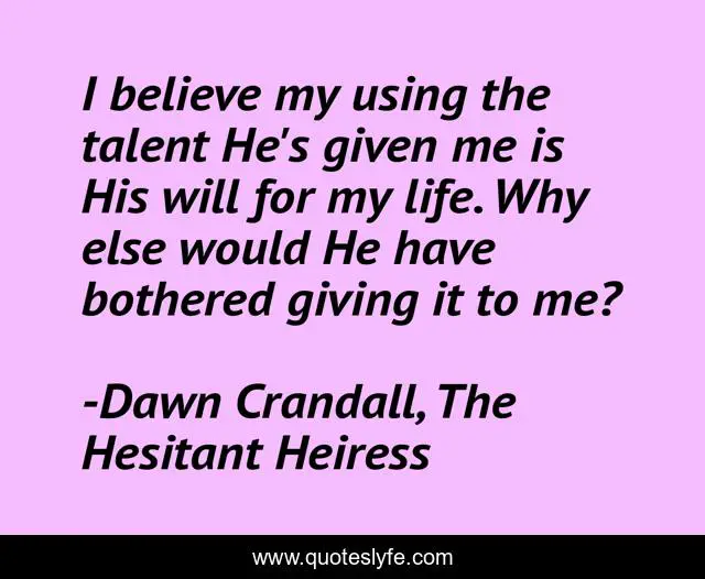 "Dawn Crandall, The Hesitant Heiress Quotes." Quoteslyfe.com, 2025. Sun. 07 Dec. 2025. <https://www.quoteslyfe.com/quote/I-believe-my-using-the-talent-He-230281>.
