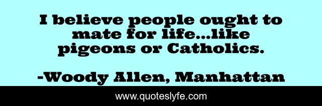 This page presents the quote "I believe people ought to mate for life...like pigeons or Catholics.". Author of this quote is Woody Allen, Manhattan. This quote is about catholics, love, humor, marriage, affection,.