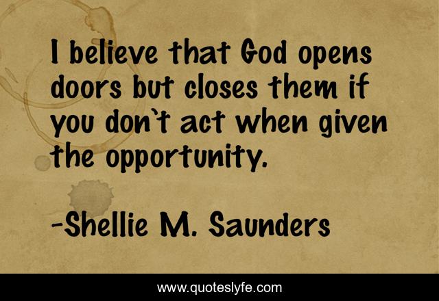 This page presents the quote "I believe that God opens doors but closes them if you don’t act when given the opportunity.". Author of this quote is Shellie M. Saunders. This quote is about god, opportunity, inspirational, enthusiasm,.