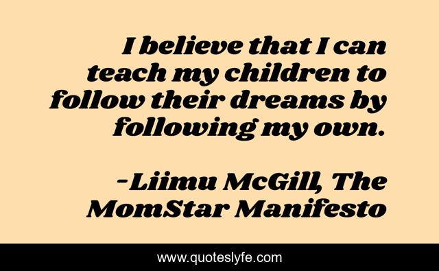 This page presents the quote "I believe that I can teach my children to follow their dreams by following my own.". Author of this quote is Liimu McGill, The MomStar Manifesto. This quote is about relationships, confidence, family, law-of-attraction, motivational, parenting, optimistic, inspirational, positive,.