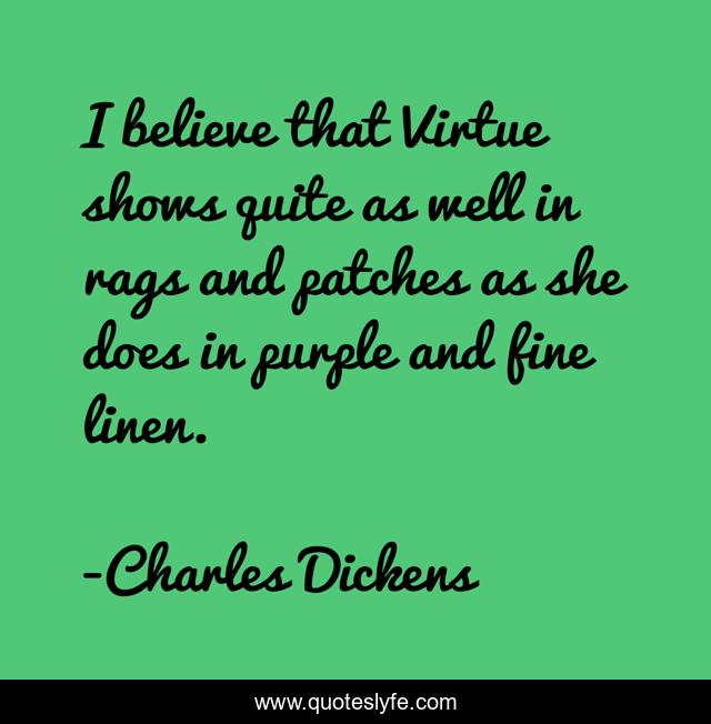 This page presents the quote "I believe that Virtue shows quite as well in rags and patches as she does in purple and fine linen.". Author of this quote is Charles Dickens. .
